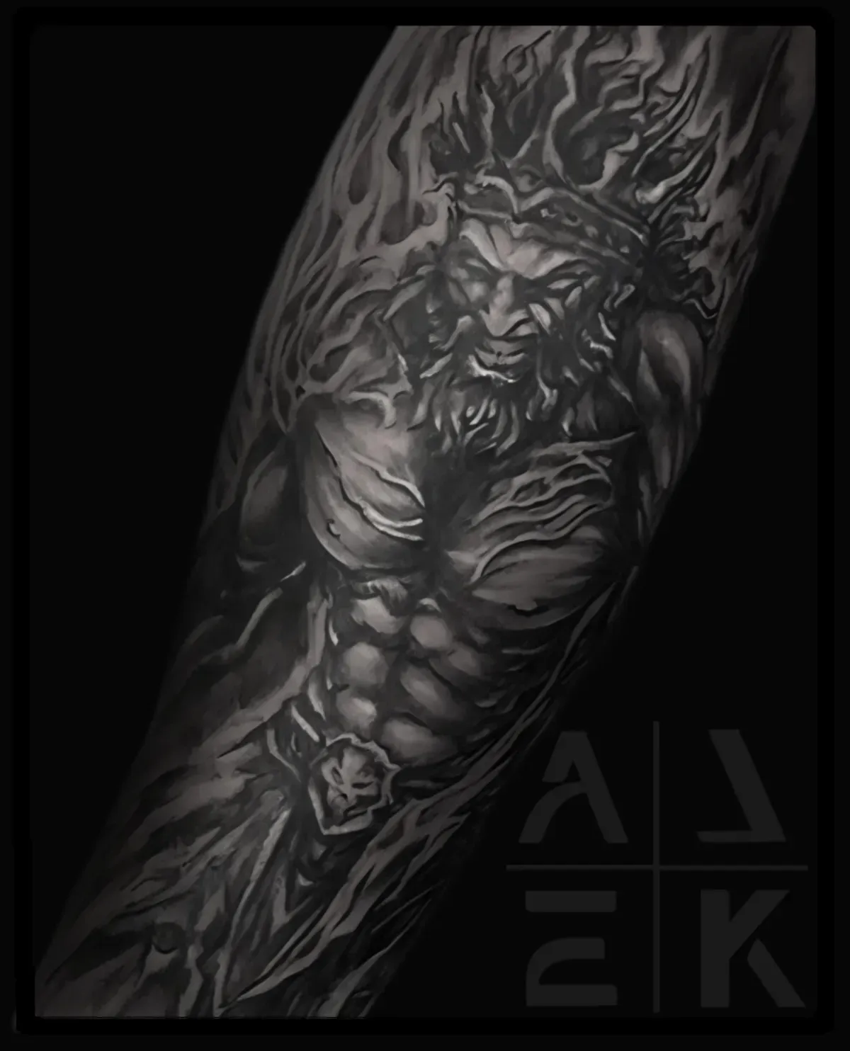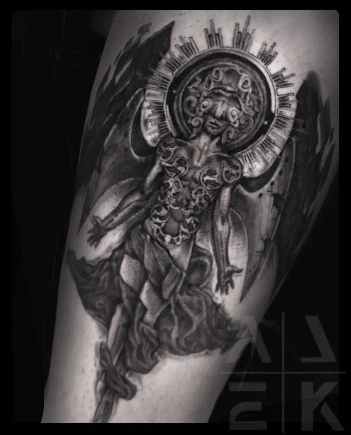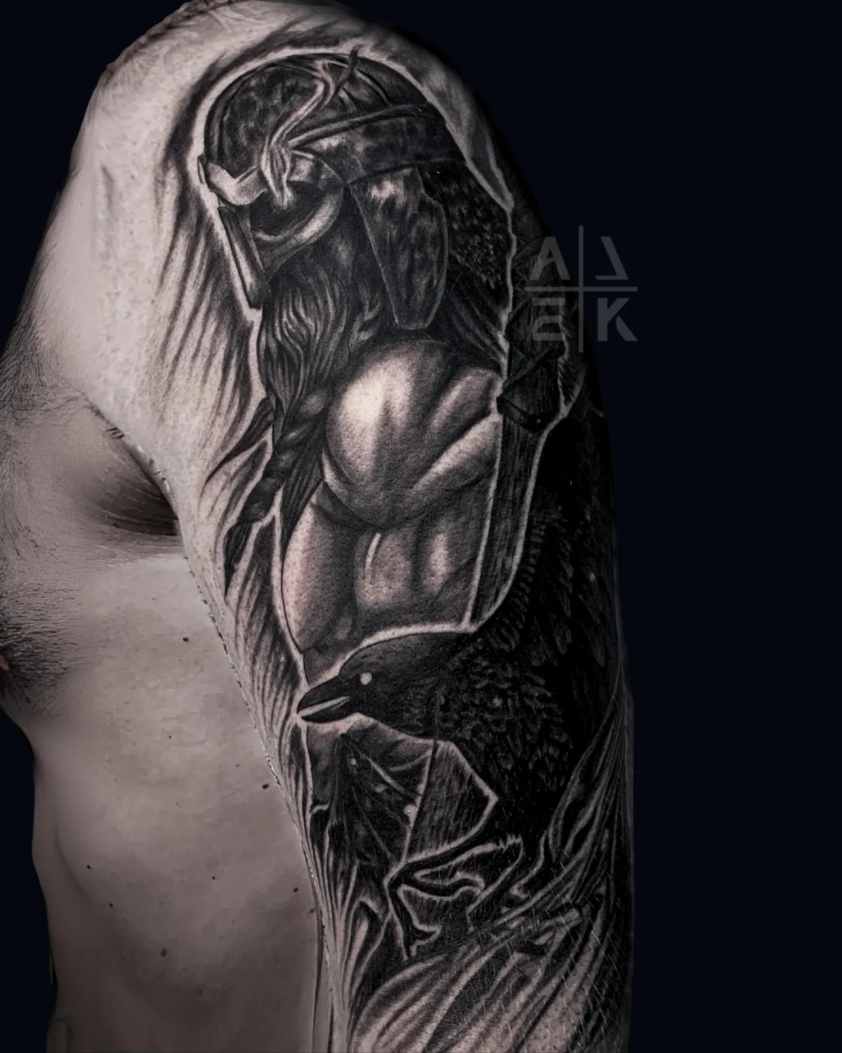 Black and gray tattoos of mythological deities and angels represent power, divinity, and protection. From Greek gods and Norse legends to fallen angels and guardians, these designs tell stories of strength, rebellion, and higher purpose. The gray wash shading brings dramatic contrast and fine detail — perfect for sleeves, back pieces, and spiritual themes.