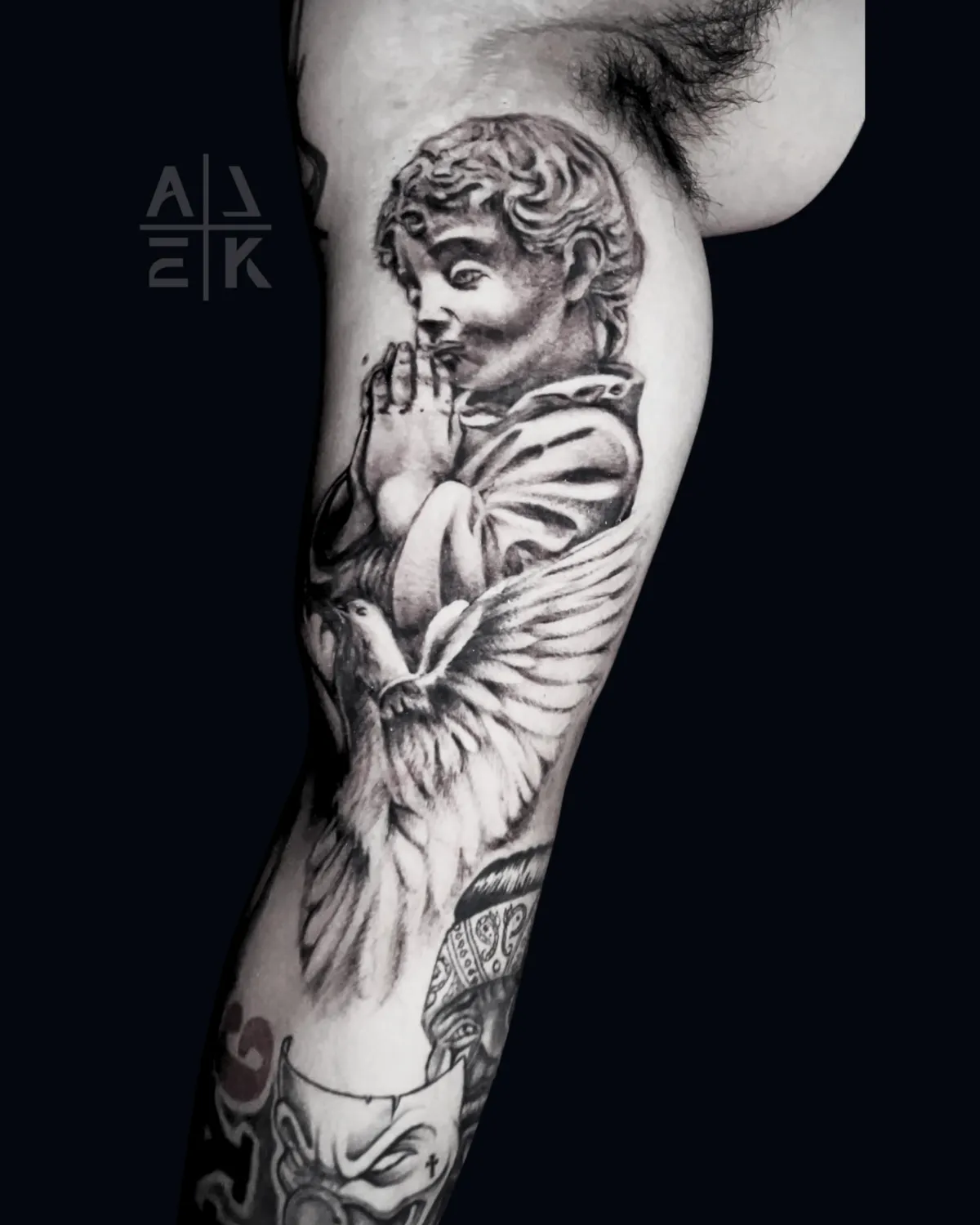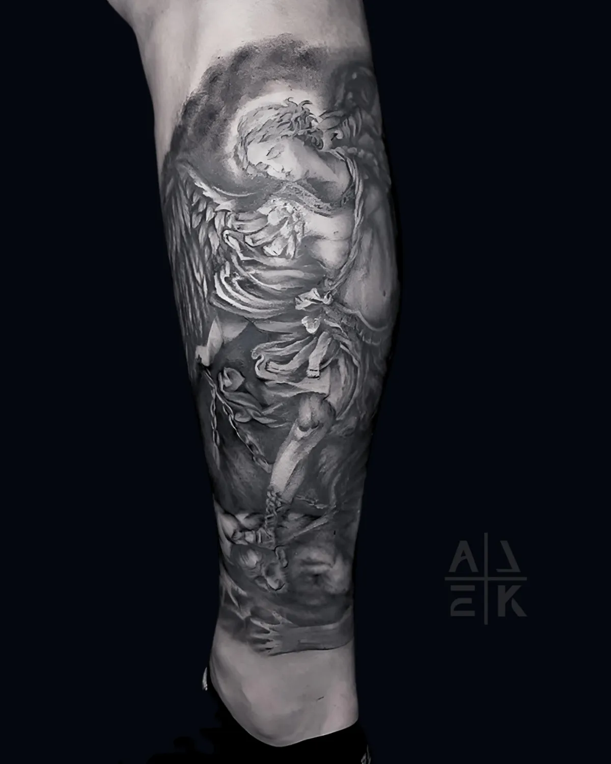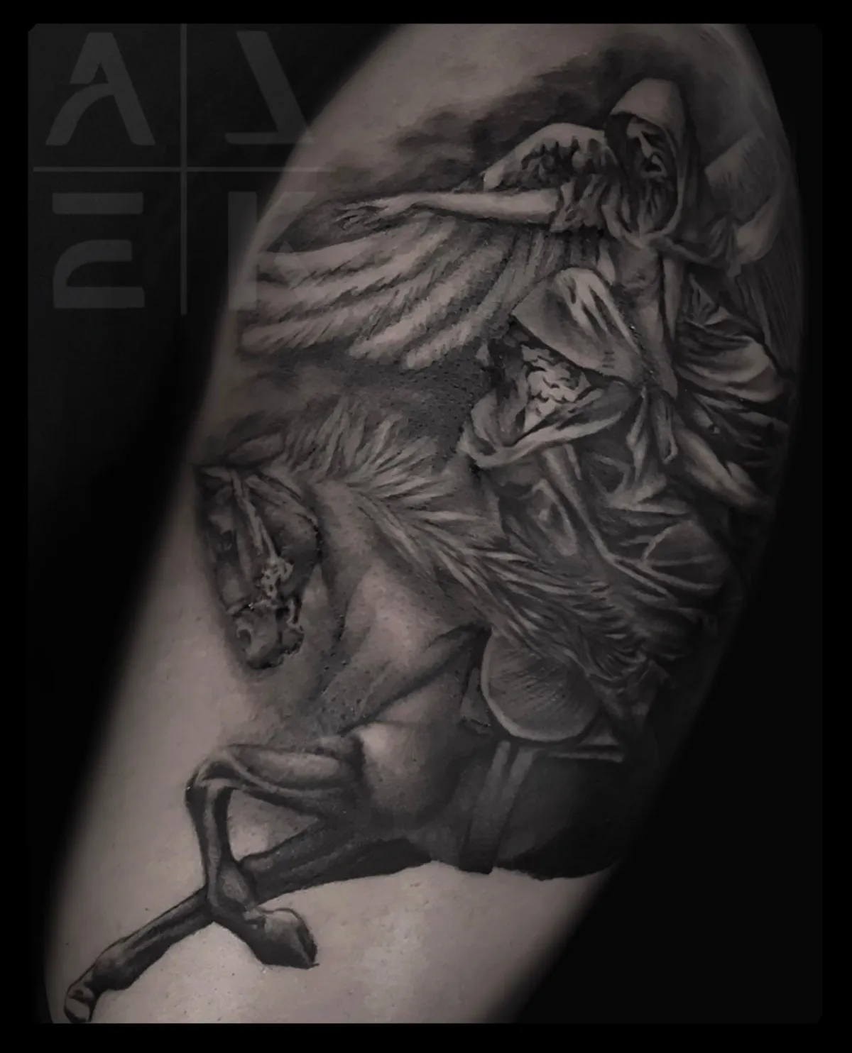 Black and gray tattoos of mythological deities and angels represent power, divinity, and protection. From Greek gods and Norse legends to fallen angels and guardians, these designs tell stories of strength, rebellion, and higher purpose. The gray wash shading brings dramatic contrast and fine detail — perfect for sleeves, back pieces, and spiritual themes.