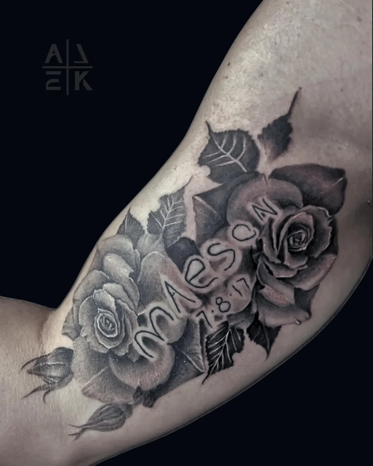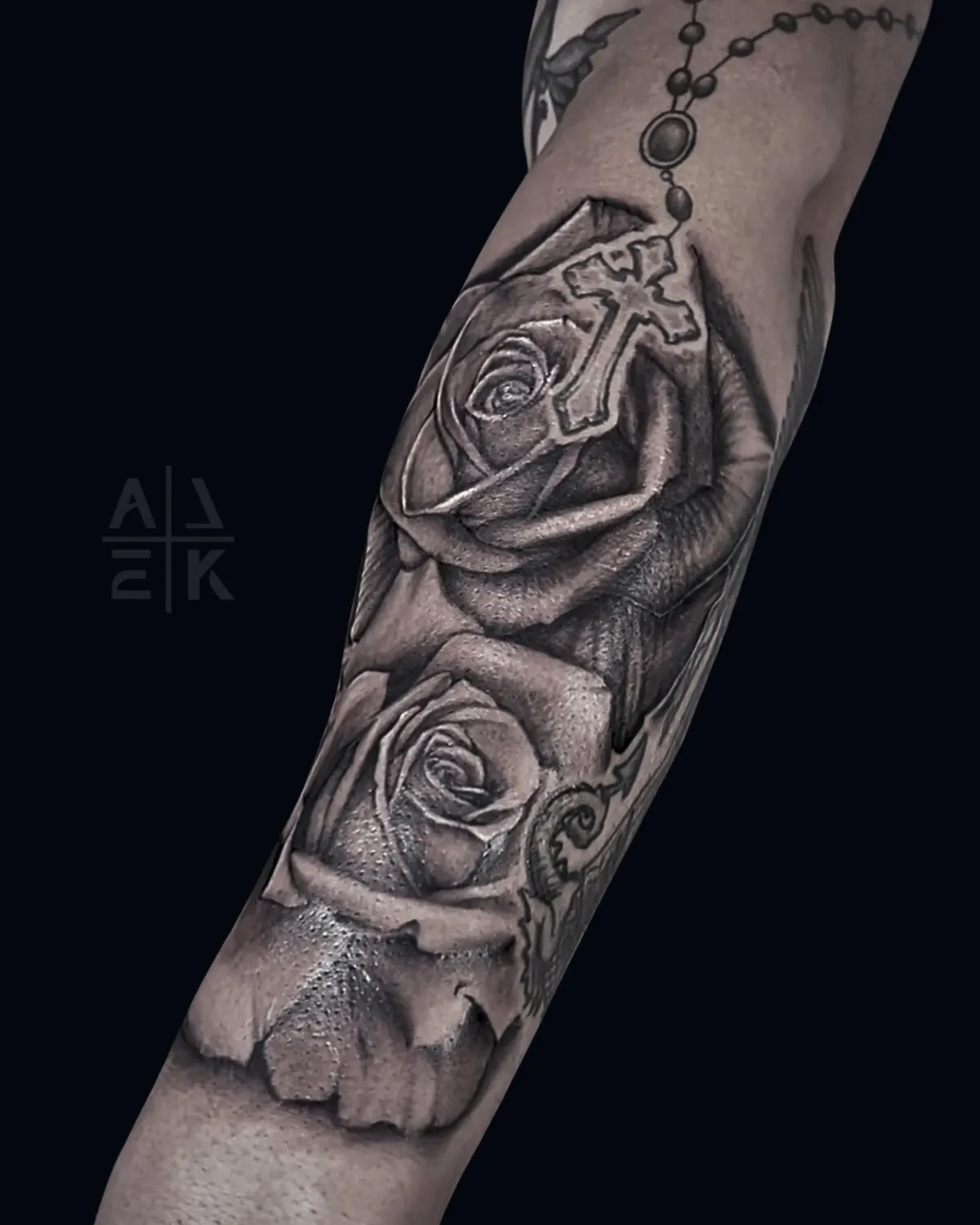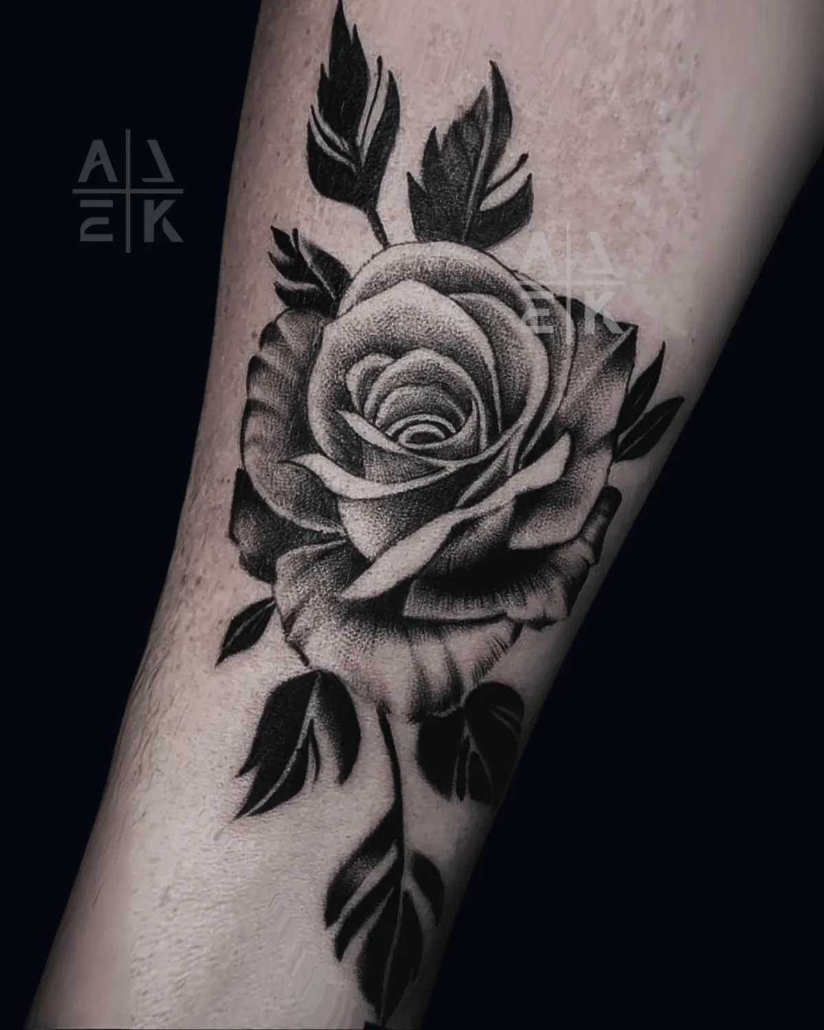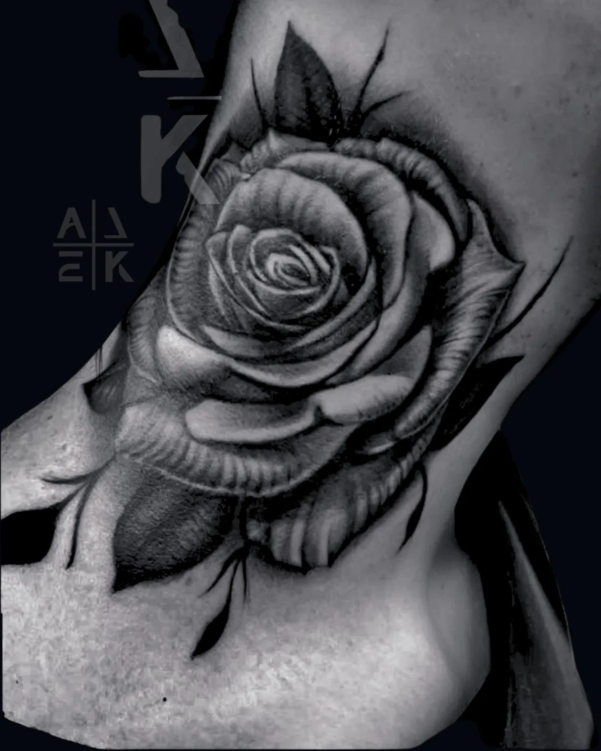 Black and gray rose tattoos use different levels of black ink to create petals with depth and detail. People love these black and gray rose tattoos for their realistic look and smooth shading.