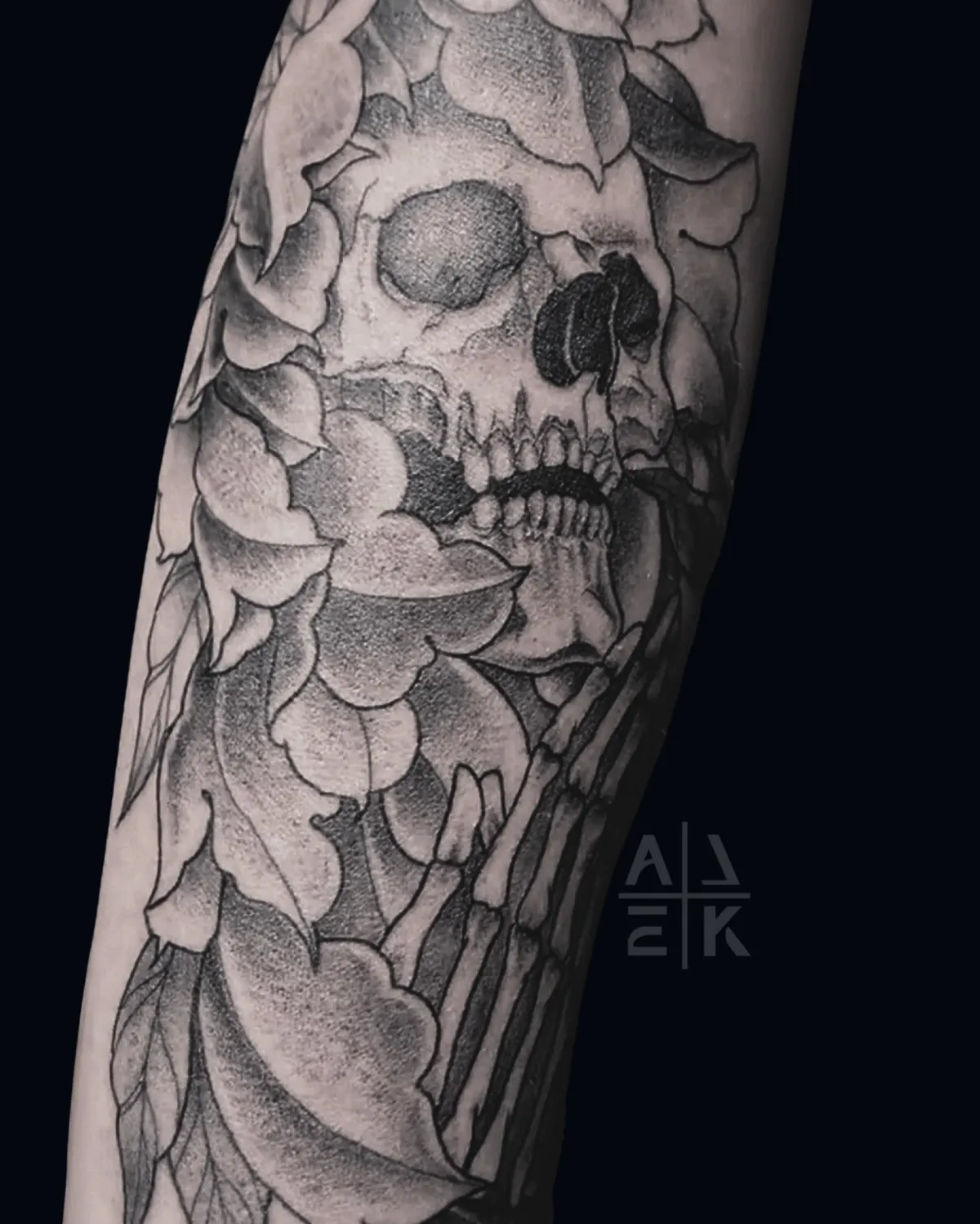 Black and gray skull tattoos represent death, rebirth, and inner strength. The gray wash style adds a moody, realistic texture — perfect for expressing life’s darker truths. Popular for sleeves, chests, and back pieces, these tattoos blend deep symbolism with bold detail.